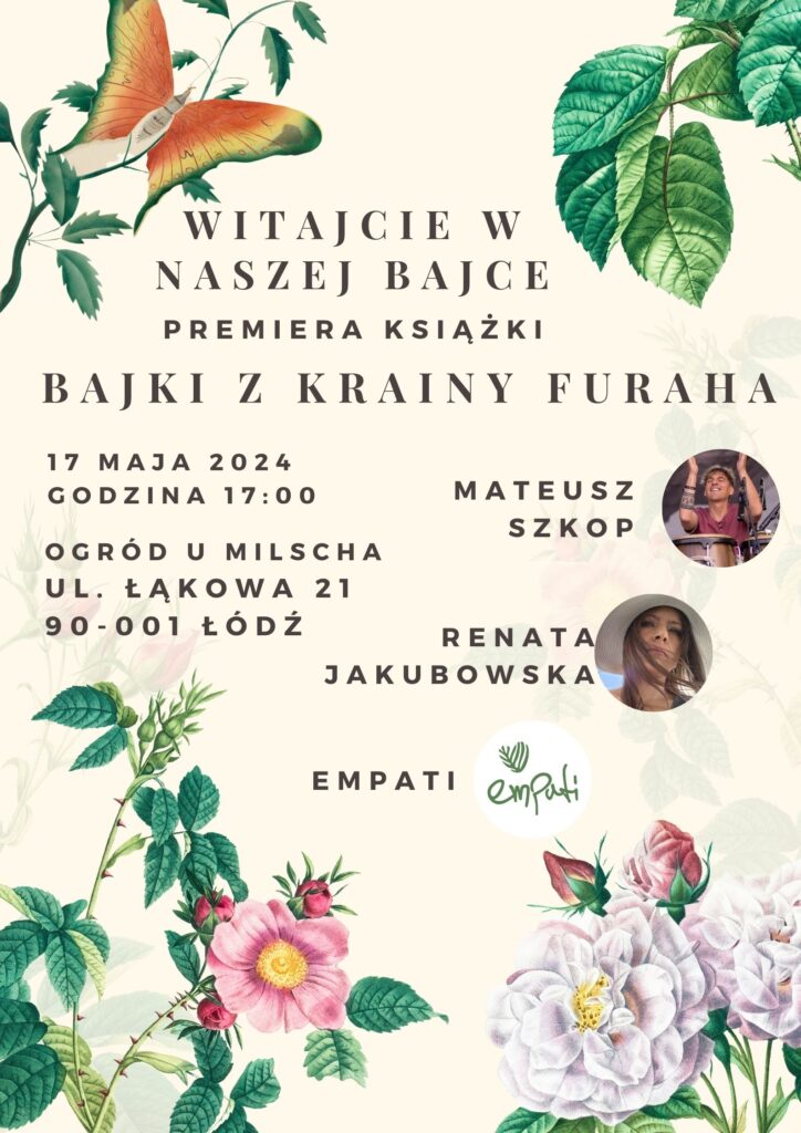 Serdecznie zapraszamy 17 maja do Łodzi, gdzie odbędzie się pierwsze premiera książki „Bajki z Krainy Furaha”, która zawiera poruszające teksty Ani Remisz, okraszone wykonanymi akwarelami, zjawiskowymi obrazami Anny Rzymskiej Dutkiewicz. Wszystkie zyski ze sprzedaży tej książki zostaną przekazane na fundację HELP FURAHA, która w dalekiej Kenii pomaga chorym dzieciom w rehabilitacji.
